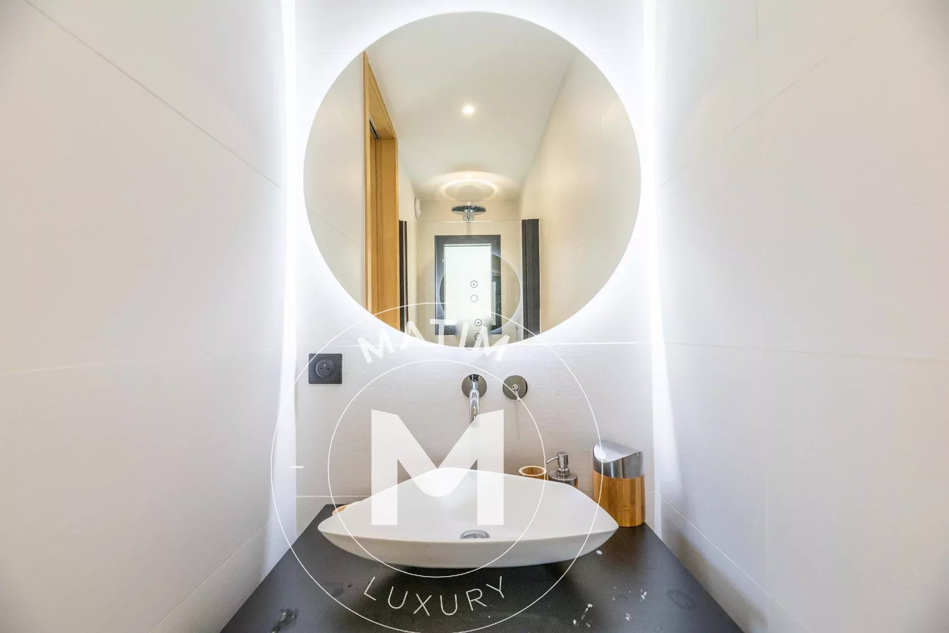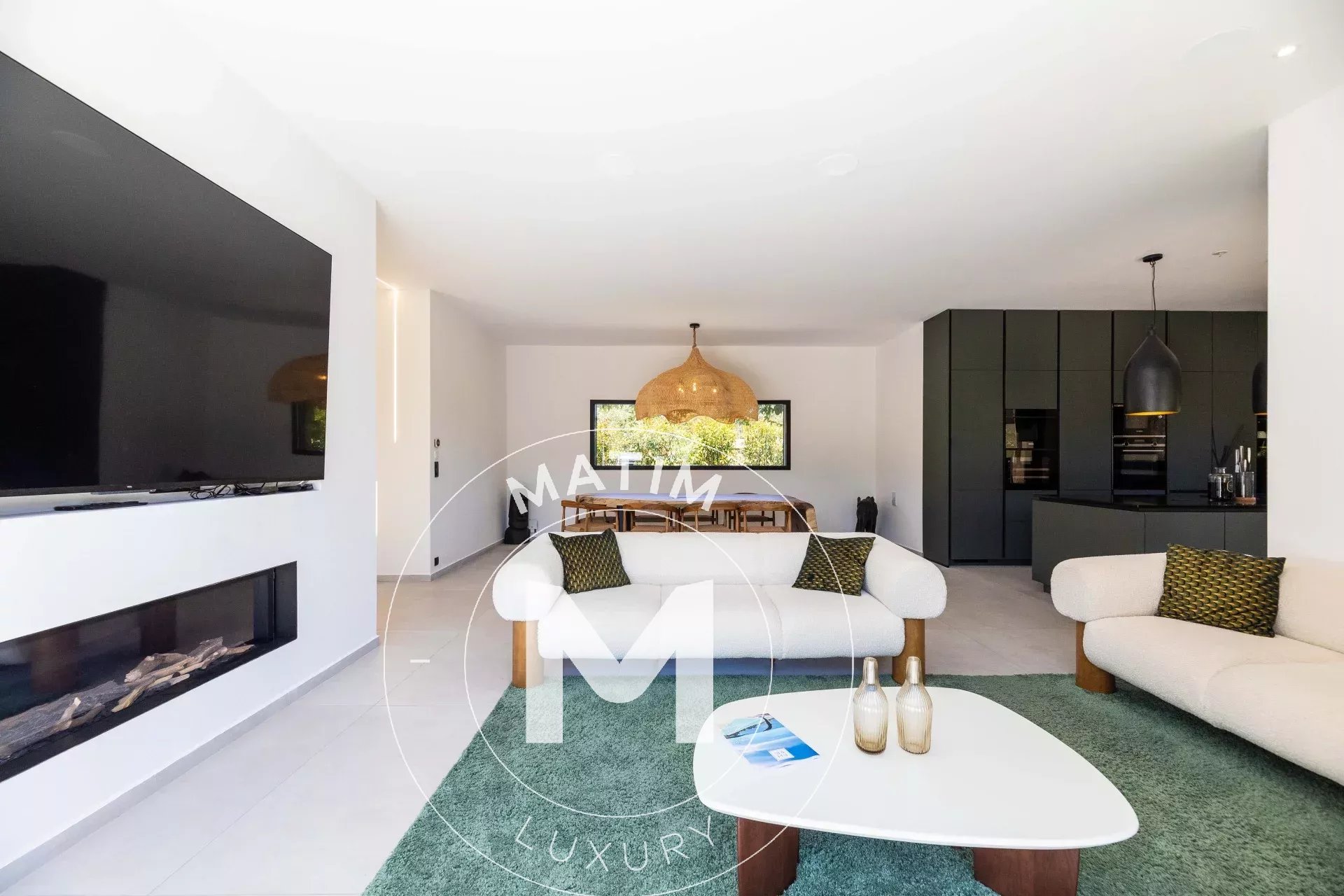 L’intérieur se distingue par ses volumes lumineux et ses finitions haut de gamme. Le séjour, particulièrement spacieux, s’ouvre largement sur l’extérieur grâce à de grandes baies vitrées. Il accueille une cuisine ouverte sur mesure, une cheminée à gaz contemporaine ainsi qu’un système audio intégré.
