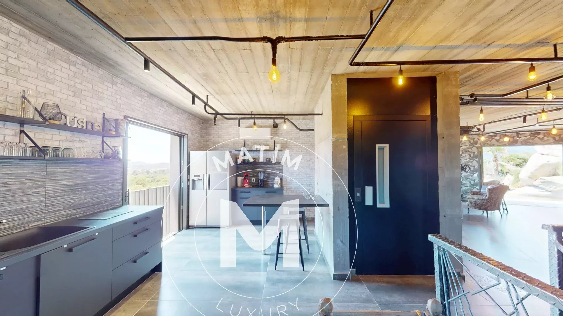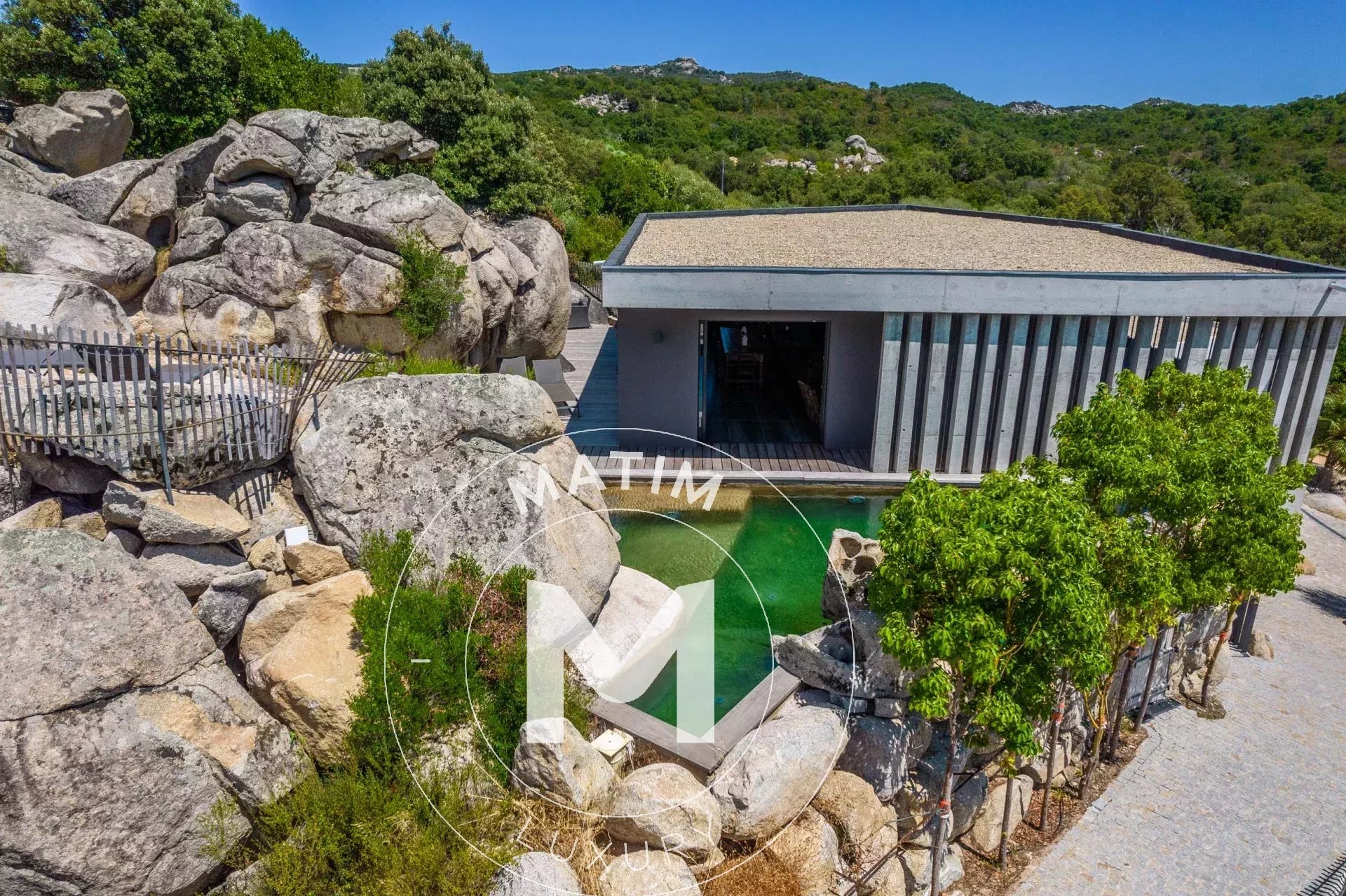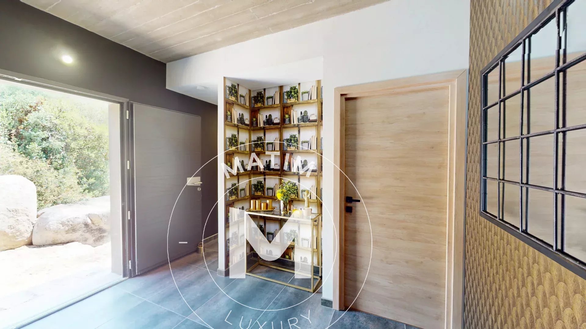 L'agence vous présente, idéalement située à proximité immédiate des plages de Saint-Cyprien et de Cala Rossa, cette villa d'architecte au caractère affirmé qui se distingue par son architecture audacieuse et son positionnement rare.